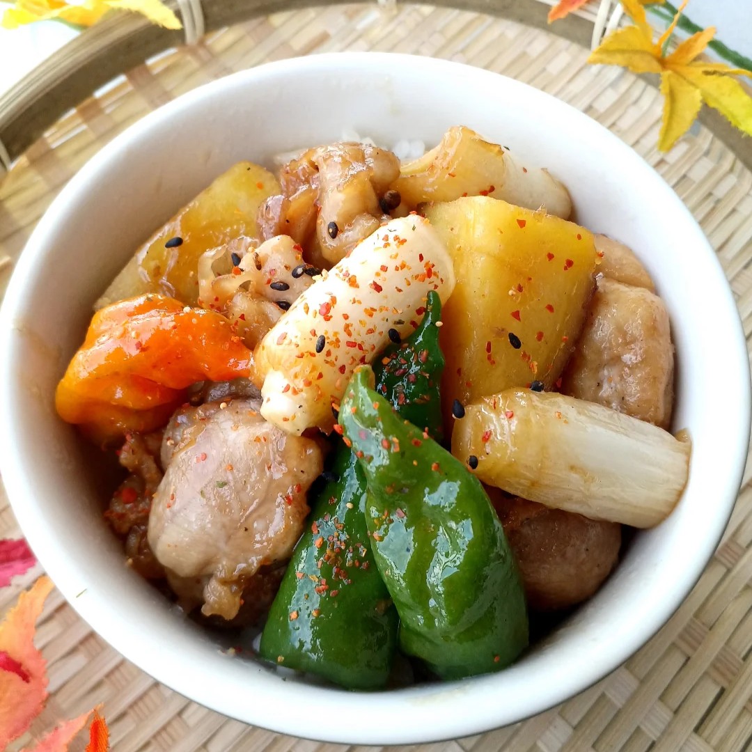 鶏もも肉とネギ、さつまいも、ししとうを焼き鳥のたれにからめた焼き鳥丼!簡単でみんな喜ぶメニュー♡